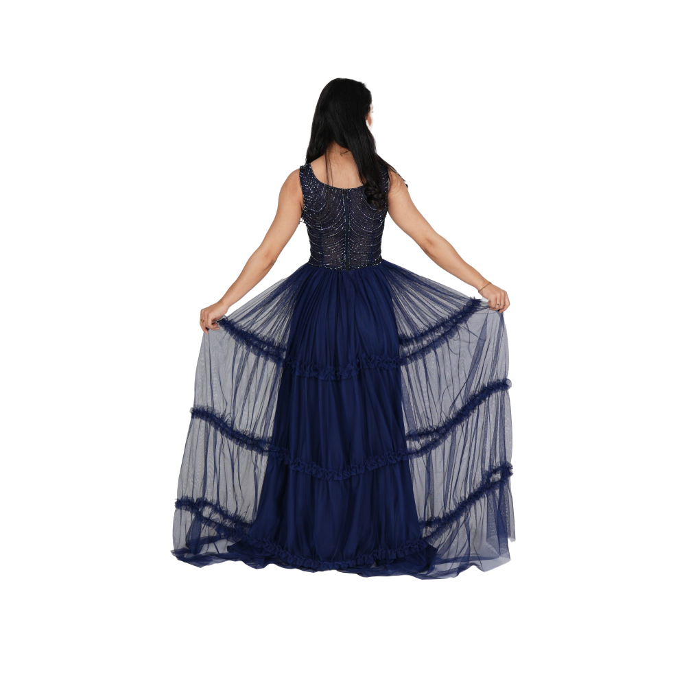 - تنورة الفستان مصنوعة من طبقات من التل مع حواف مكشكشة، مما يمنحها حركة وحيوية.