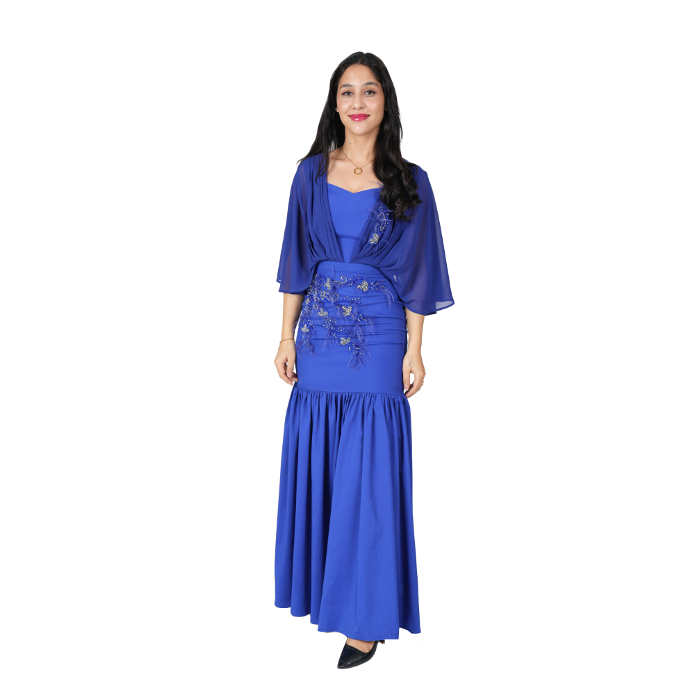 · صدر مطرز: الجزء العلوي مزين بتطريزات فضية براقة تعكس الفخامة والرقي.