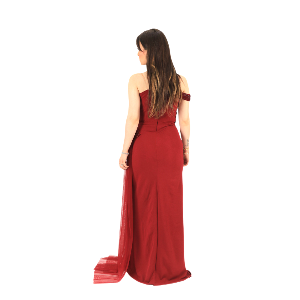 - طويل وانسيابي: يمنح الفستان مظهرًا رشيقًا ومتوازنًا.